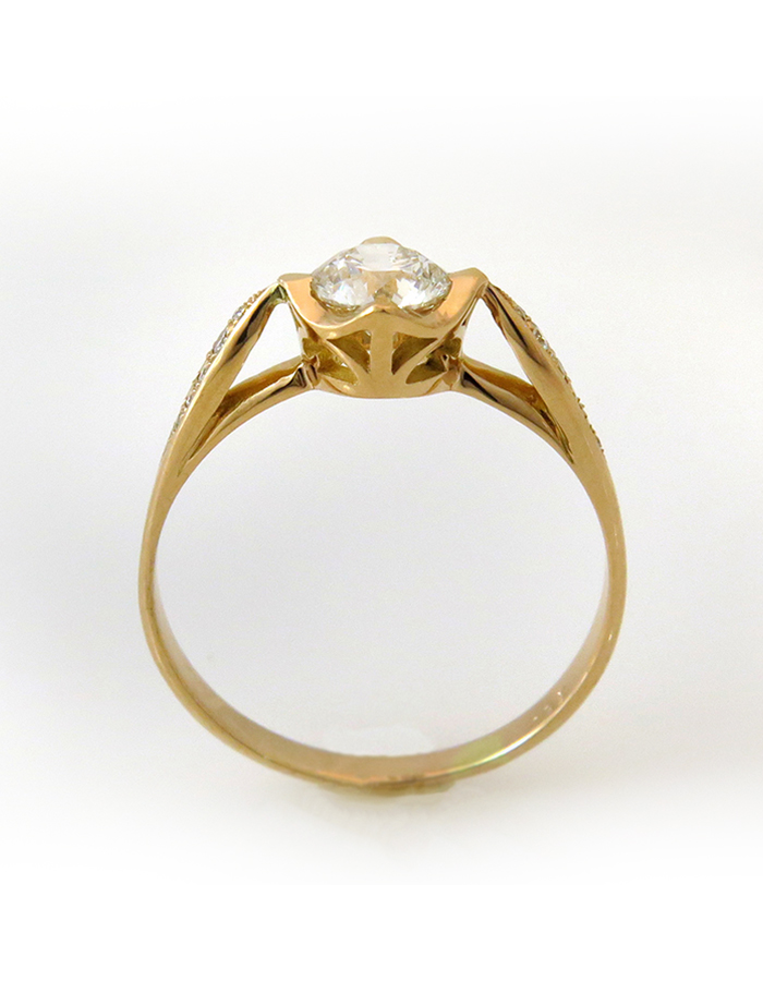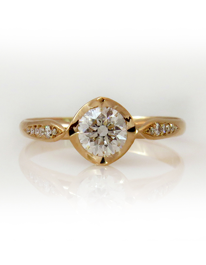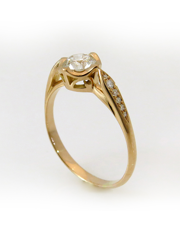 טבעת המיוצרת מ-18 קראט זהב אדום טבעי ומשובצת ביהלום עגול טבעי במשקל 0.52ct ו-6 יהלומים נוספים בכל צד. עיצוב טבעת האירוסין תגרום לכם לרחף בזמן. בטבעת מופלאה זו ניתן להרגיש את המאה ה-19 . לייצור הטבעת השתמשתי בזהב לבן טבעי יפיפה. תעודה : היהלום מאושר ע”י independent institute EGL (European Gemological Laboratory). התעודה תשלח עם הטבעת.
