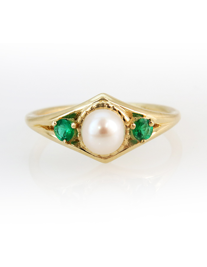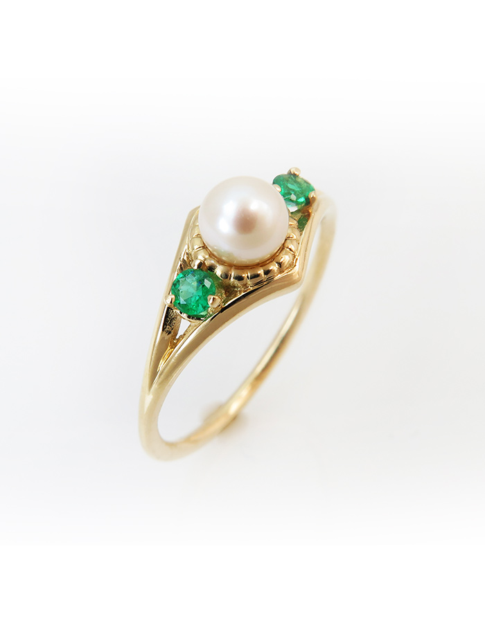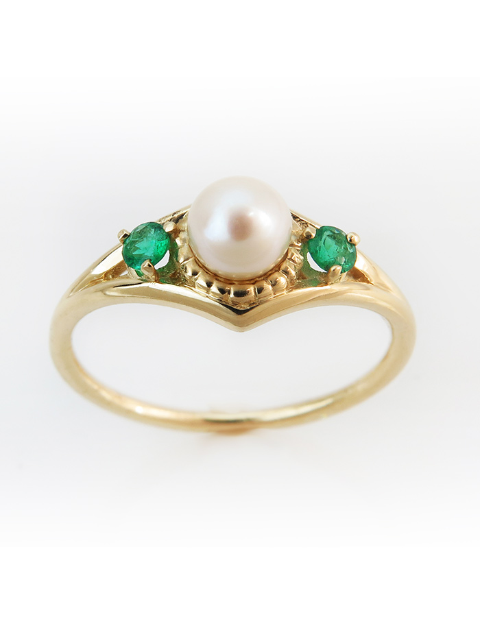 טבעת זהב צהוב 14 קרט עם פנינה יפיפיה ואבני אמרלד בצדדים