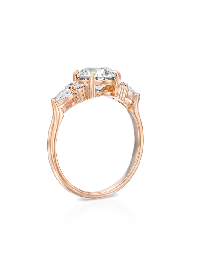 משני צידי היהלום המרכזי, משובצים יהלומים לבנים נוצצים. שילוב של חיתוכים עגולים וחיתוך טיפה יוצר עיצוב צדדי מורכב ומלא עניין.
