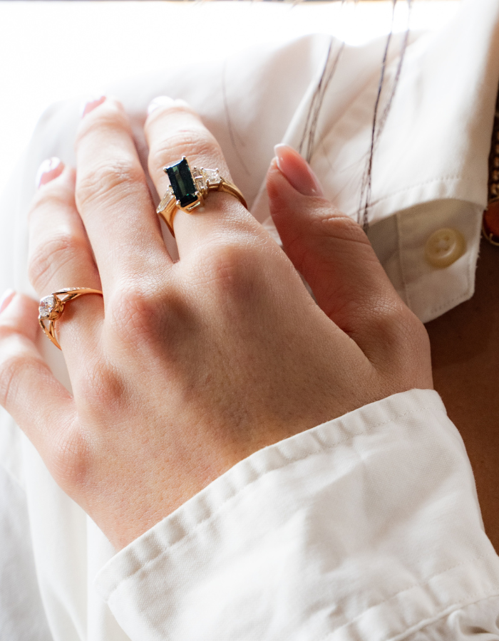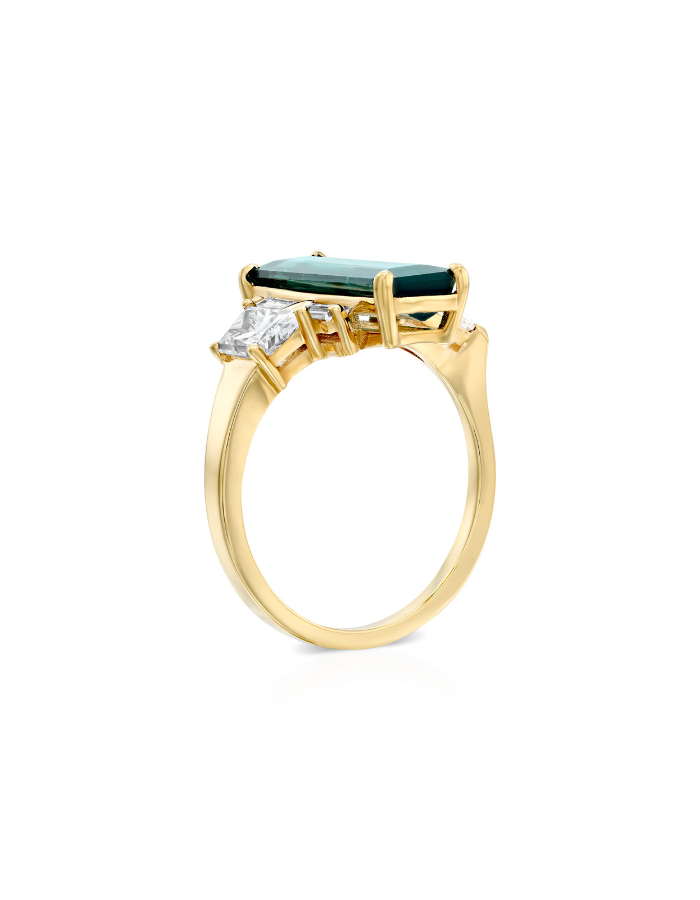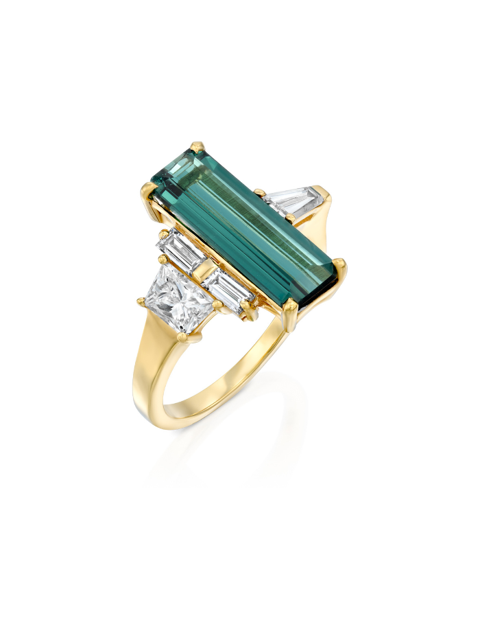 טבעת יוקרתית עם טורמלין בגט ויהלומים בצורות שונות – עיצוב א-סימטרי ייחודי