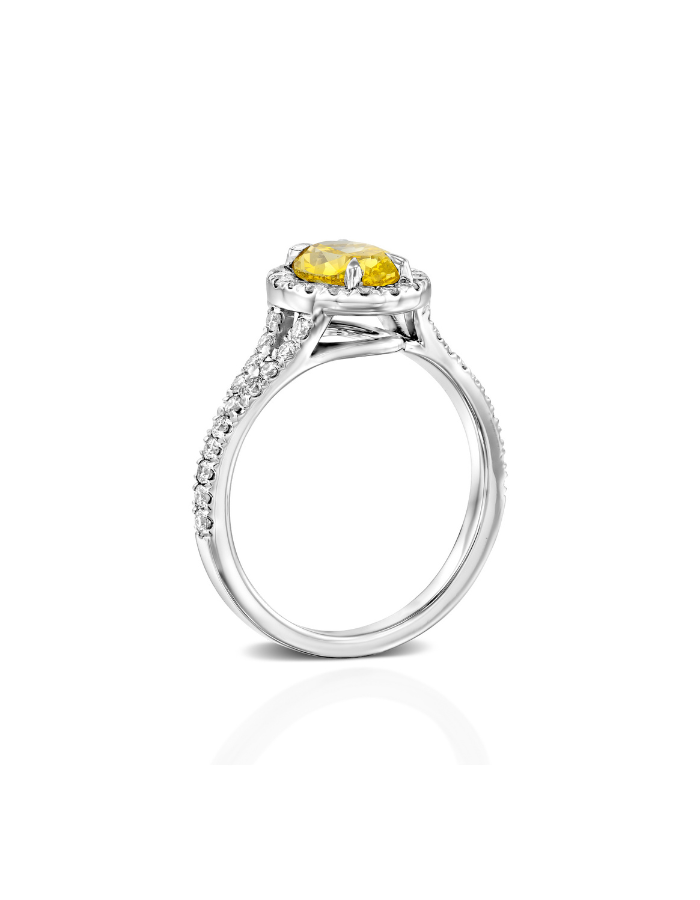 טבעת היילו זהב לבן משובצת יהלום צהוב אובלי ויהלומים לבנים מסביב
