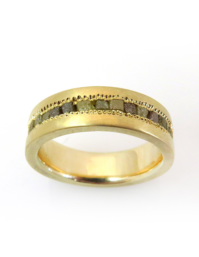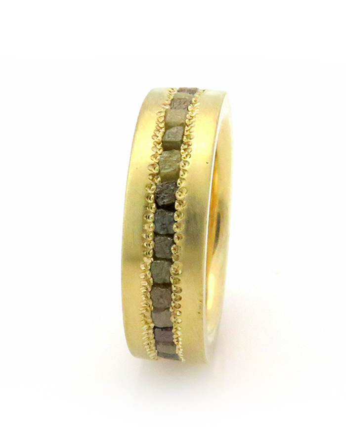 טבעת זהב 18K משובצת יהלומי גלם בחיתוך קוביה משובצים בצורה יפייפיה ומיוחדת שמכניסה המון אופי לתכשיט