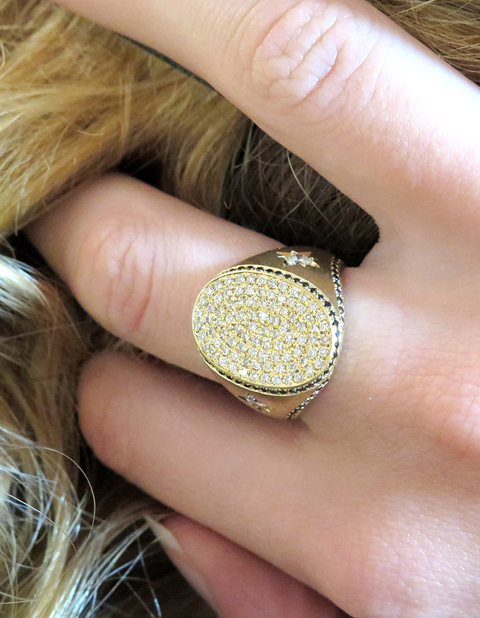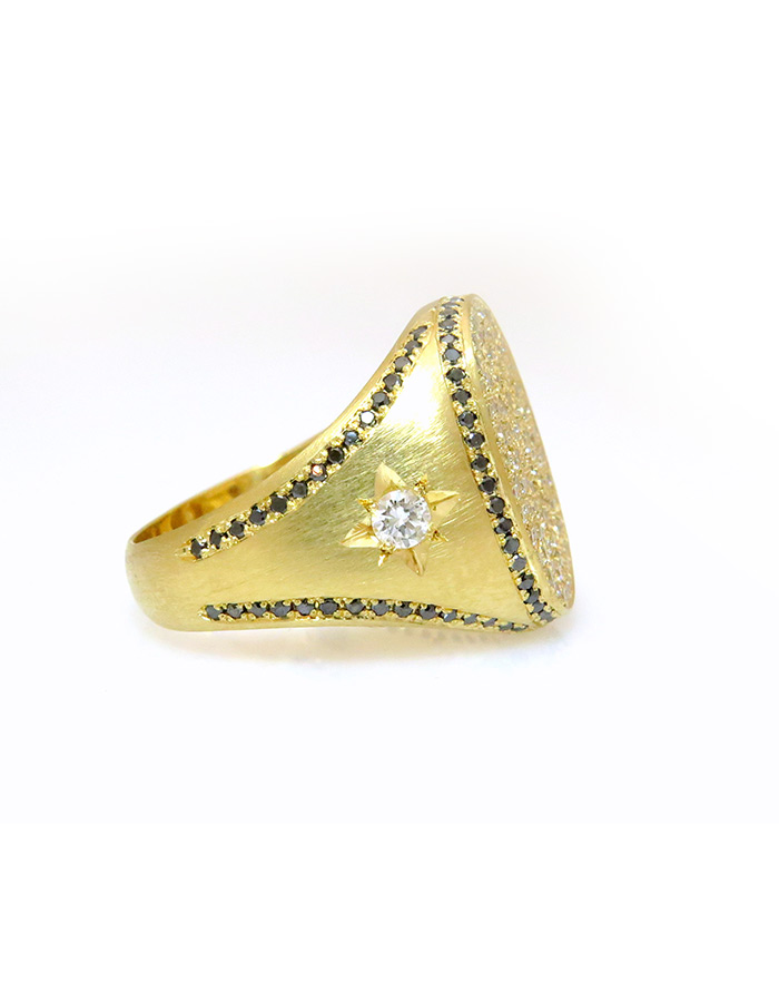 טבעת חותם אובלית מזהב 18 קרט משובץ יהלומים לבנים ושחורים בשיבוץ פאבה