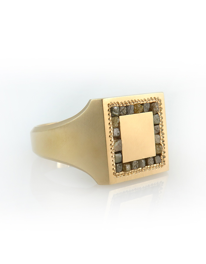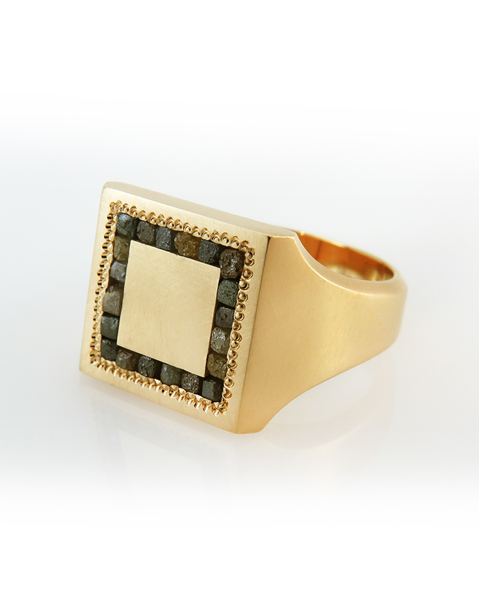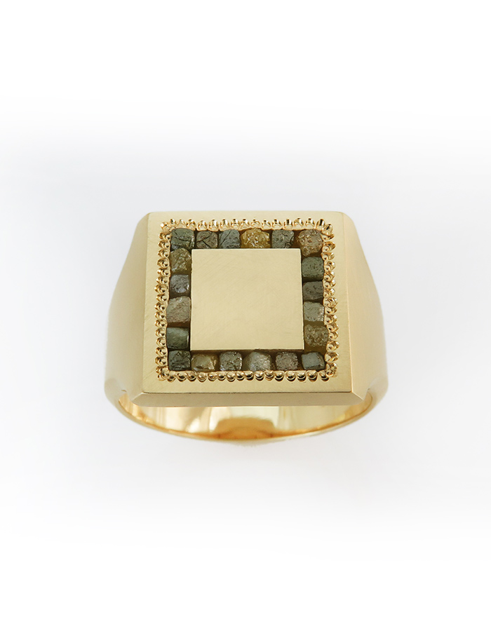 טבעת חותם ייחודית, עשויה זהב 18K משובצת יהלומי גלם בחיתוך קוביה משובצים בצורה יפייפיה ומיוחדת שמכניסה המון אופי לתכשיט
