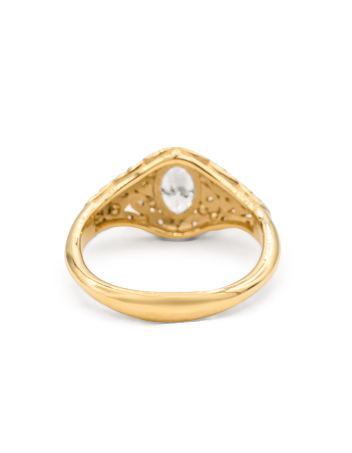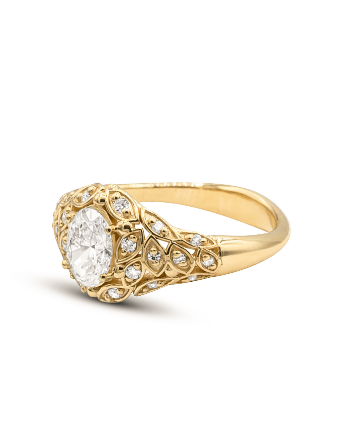 טבעת בסגנון וינטג’ עשויה זהב 18K שבמרכזה הלום אובלי ו 22 יהלומים קטנים
