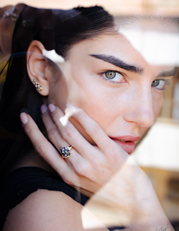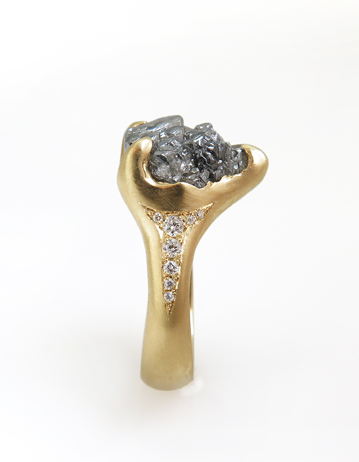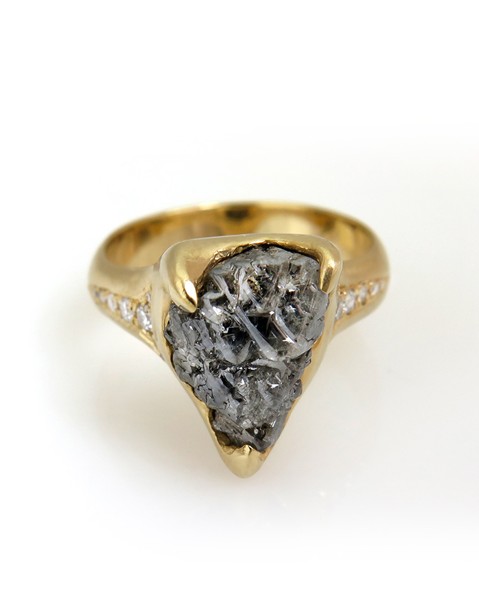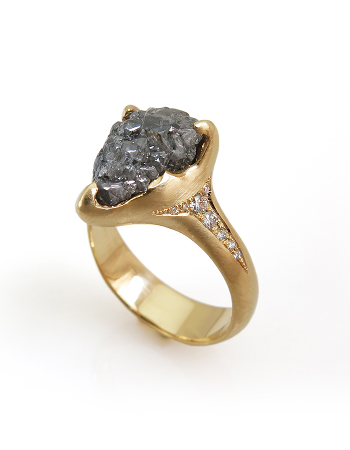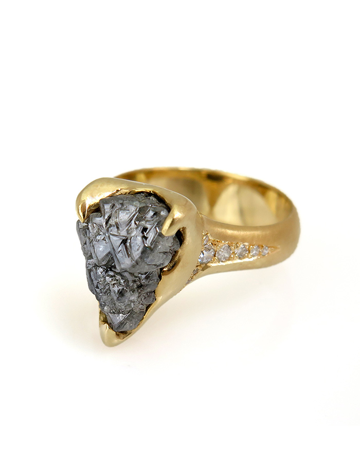 טבעת זהב 18K משובצת יהלום גולמי ייחודי ויפייפה מעוטר ביהלומים לבנים באיכות גבוה מאוד