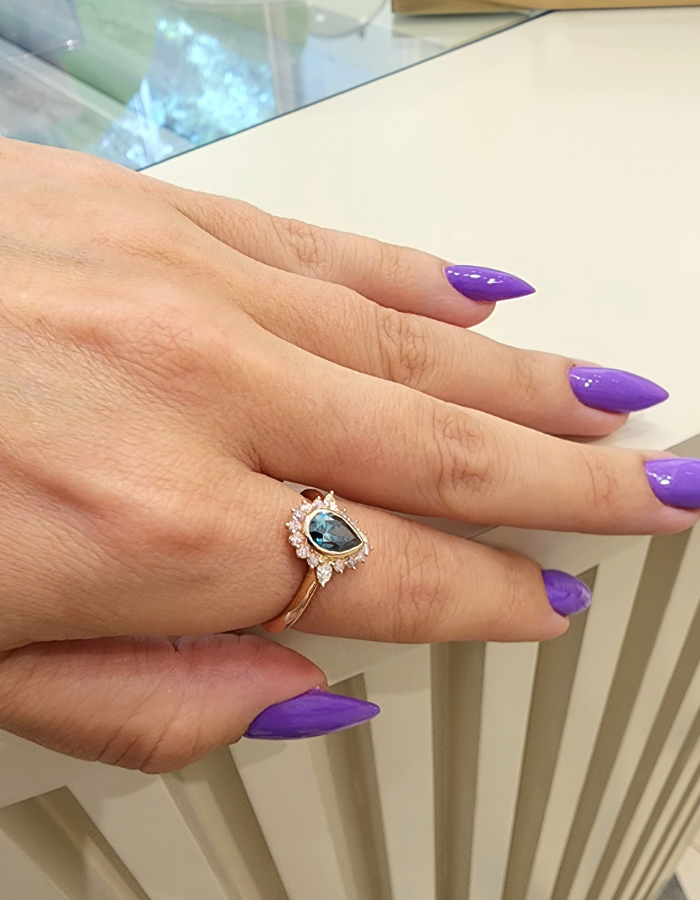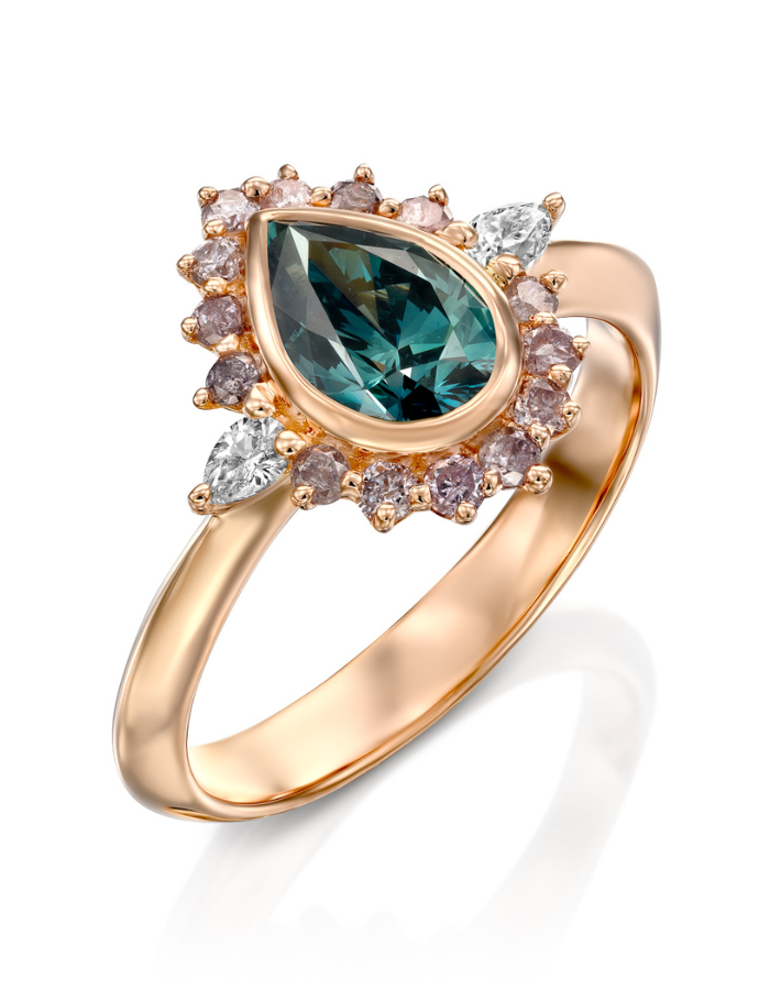 טבעת יוצאת דופן משובצת יהלום כחול בצורת טיפה ומסביב יהלומים ורודים ולבנים