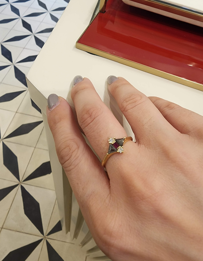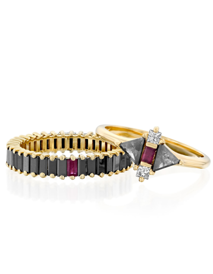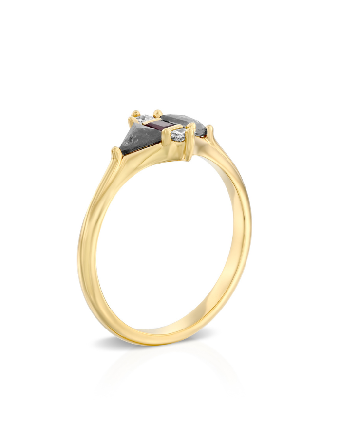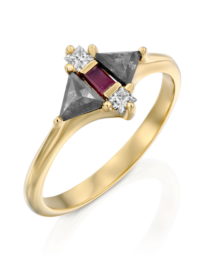 טבעת עדינה ומיוחדת משובצת אבן רובי מרכזית בחיתוך באגט, שני יהלומים מרובעים בחיתוך פרינסס ויהלומי Salt&pepper משולשים מכל צד