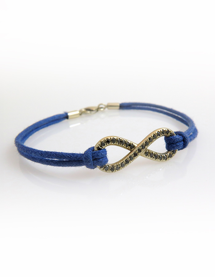 צמיד Infinity מדהים ביופיו המיוצר מ-14 קראט יהלומים לבנים טבעיים ומשובץ ב-38 יהלומים שחורים טבעיים.