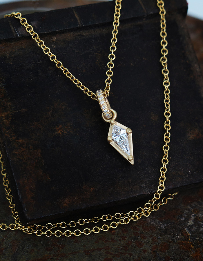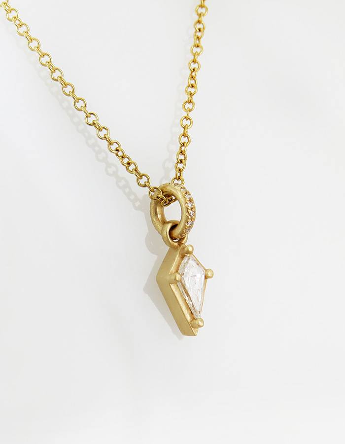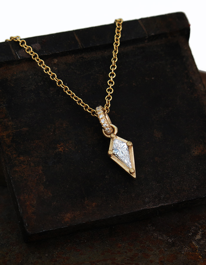 תליון גאומטרי מדויק ומיוחד, עשוי זהב 18 קרט לבן ומשובץ יהלום מדהים וייחודי בחיתוך KITE