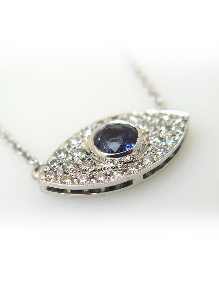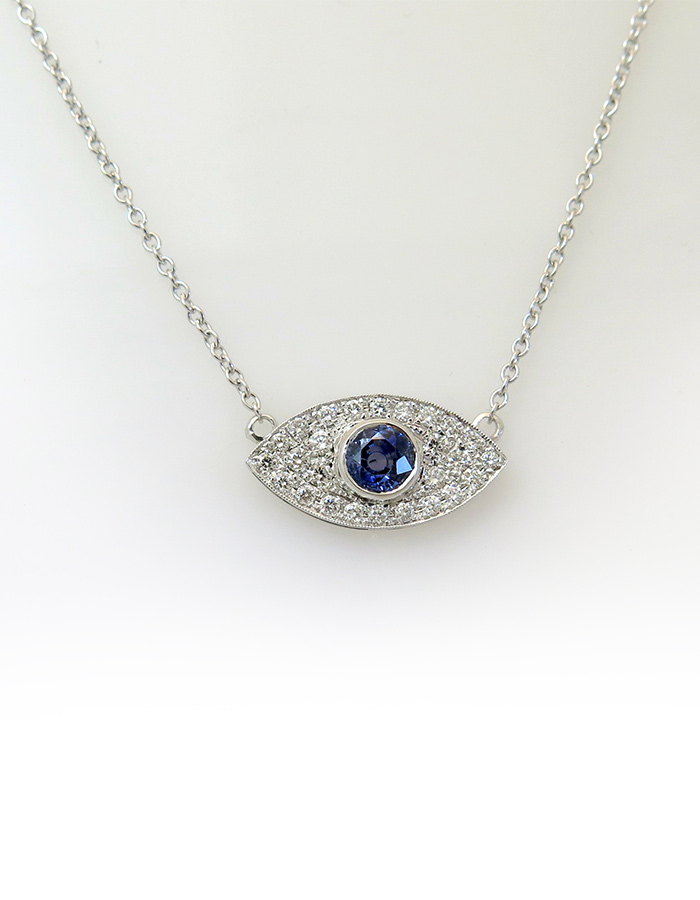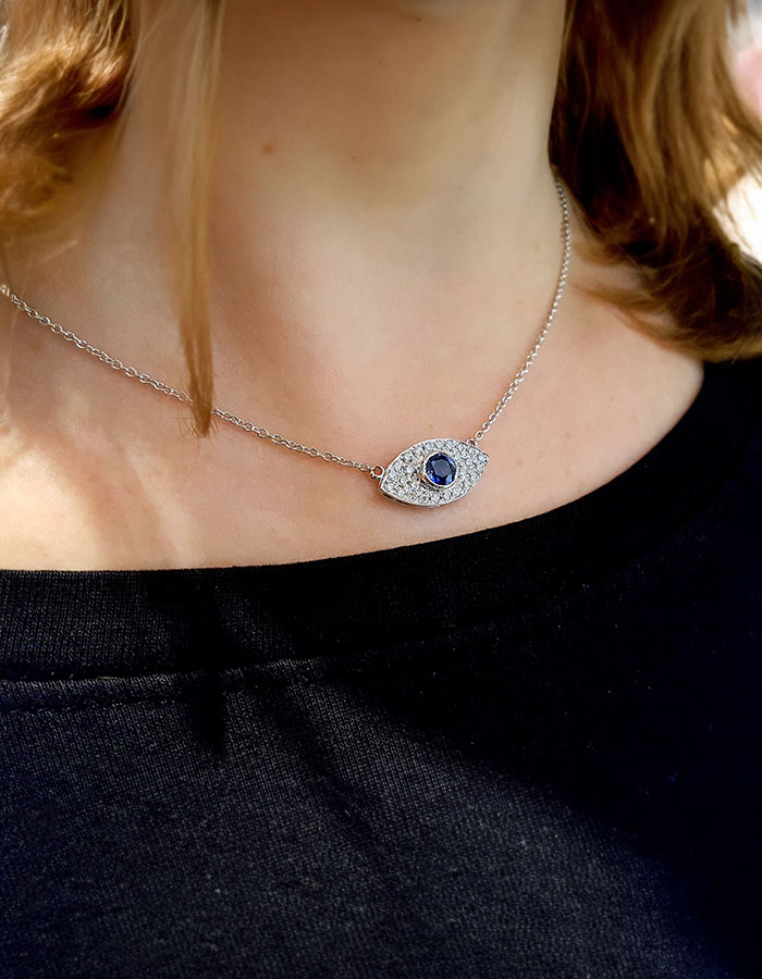 שרשרת עם תליון נגד “עין הרע” מזהב לבן 14K בעיצוב יחודי עם שילוב של אוריינטאליות ומודרניות.